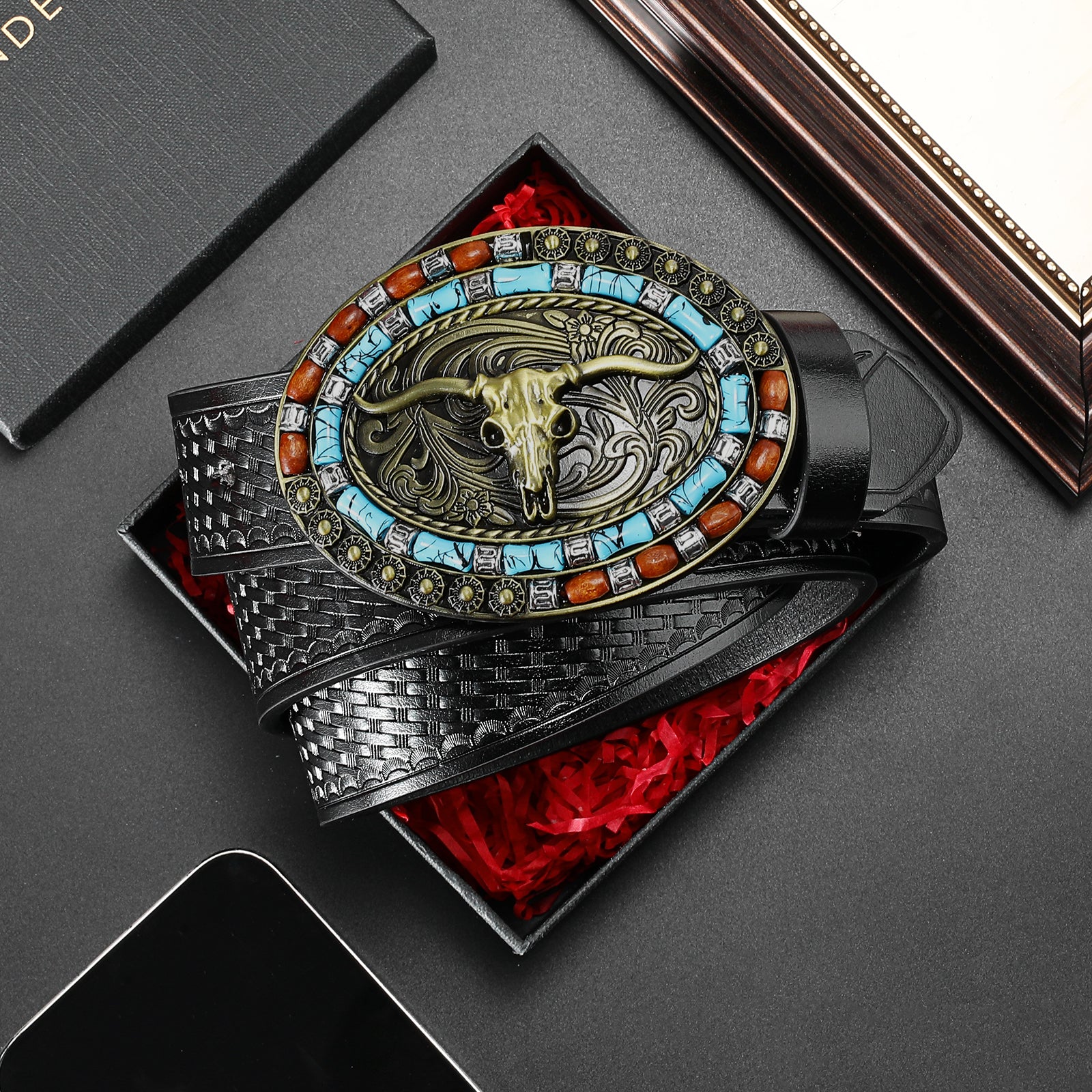 SENDEFN Western Cowboy Belt for Men Women Longhorn Bull Buckle Belt Floral Engraved Belts 1.5" Wide for Jeans